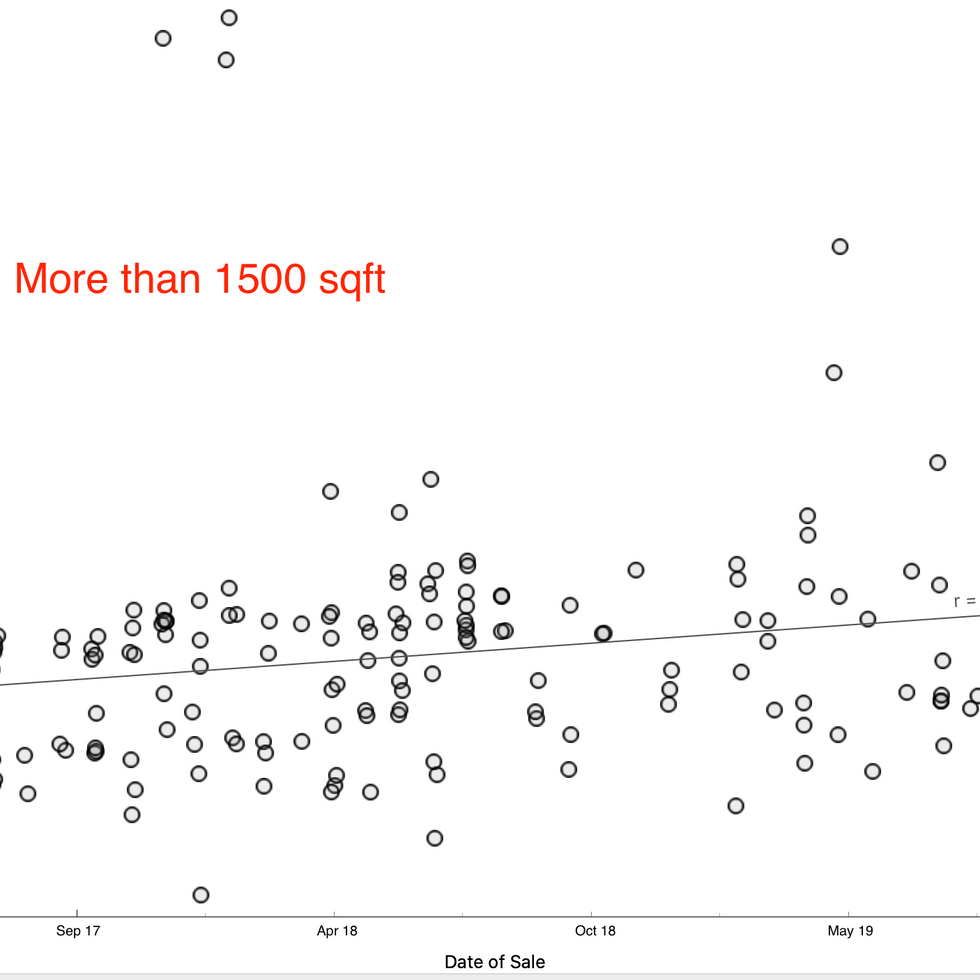 From this line of best fit, you could also better understand if you are "over-paying" for your property purchase (eg. if you property is above the line of best fit). Taking a quick glance at the scatter plot, your transaction will be on the high side if you are paying more than $1500 psf in Dec 2019. Of course, there could be many factors such as location, tenure etc that could influence your buying price. This is still a general assumption.